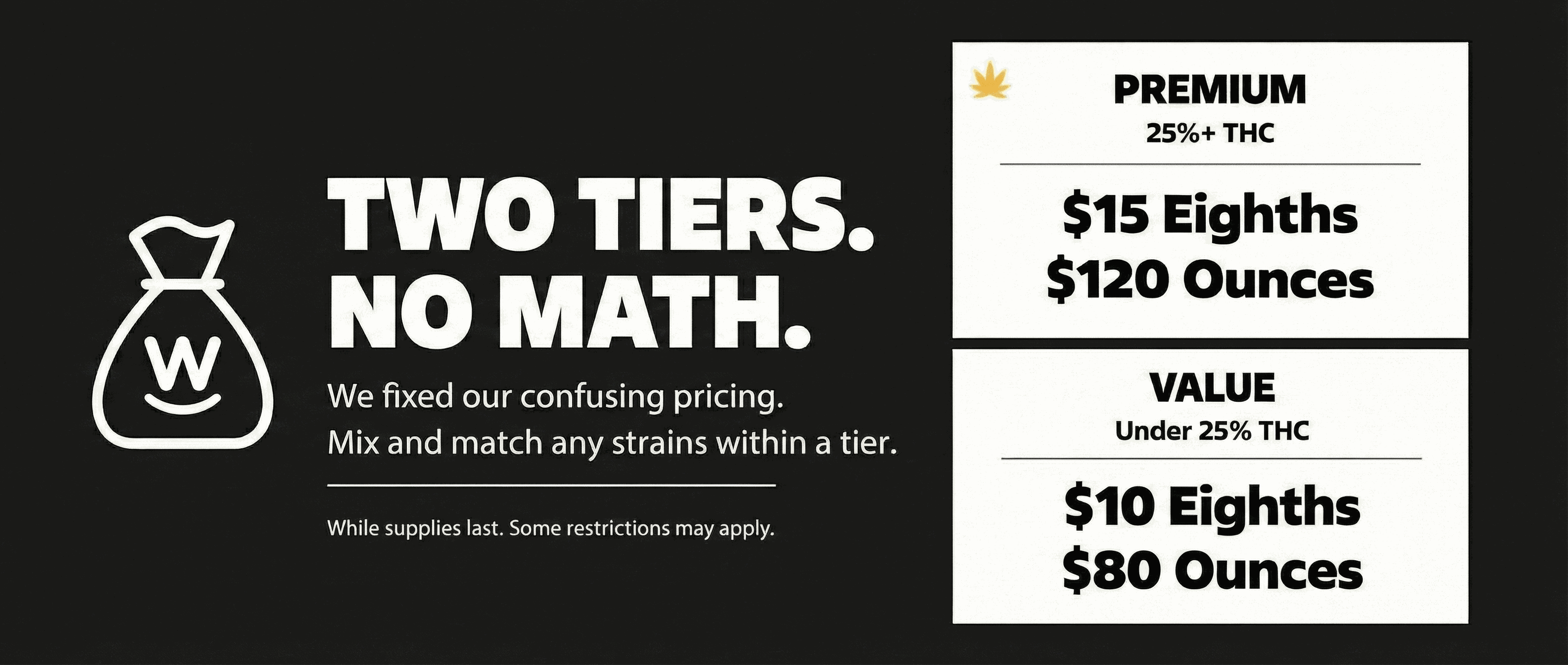 Our flower is different. It's terpene packed. It's beautiful. It stinks to high heaven. It's really good. We're growing strains found nowhere else in the world. That's because we're breeders. This is what we do. We're also growers, and because we're growers, we don't buy weed from other growers. This allows us to sell top-shelf weed at bottom-shelf prices. The better you grow, the more you get. All the weed we sell at our cannabis store in Monroe is excellent. Still, we decided to break it up into three tiers anyway. "Weed," "Good Weed," and "Really Good Weed." Our criteria for determining what strains go on which tier are different from most dispensaries in Monroe. But hey, we're not in the business of being the same.