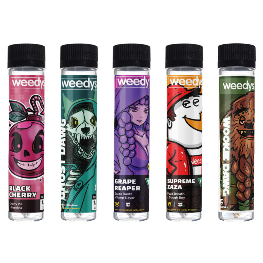 Potent, flavorful strains for the ultimate experience. Perfect for a deep, relaxing couch high, long laughs, and good vibes. Includes 5 different 1g prerolls: (Strains may vary depending on availability) - Black Cherry - Ghost Dawg - Grape Reaper - Supreme ZaZa - Wookie Dawg